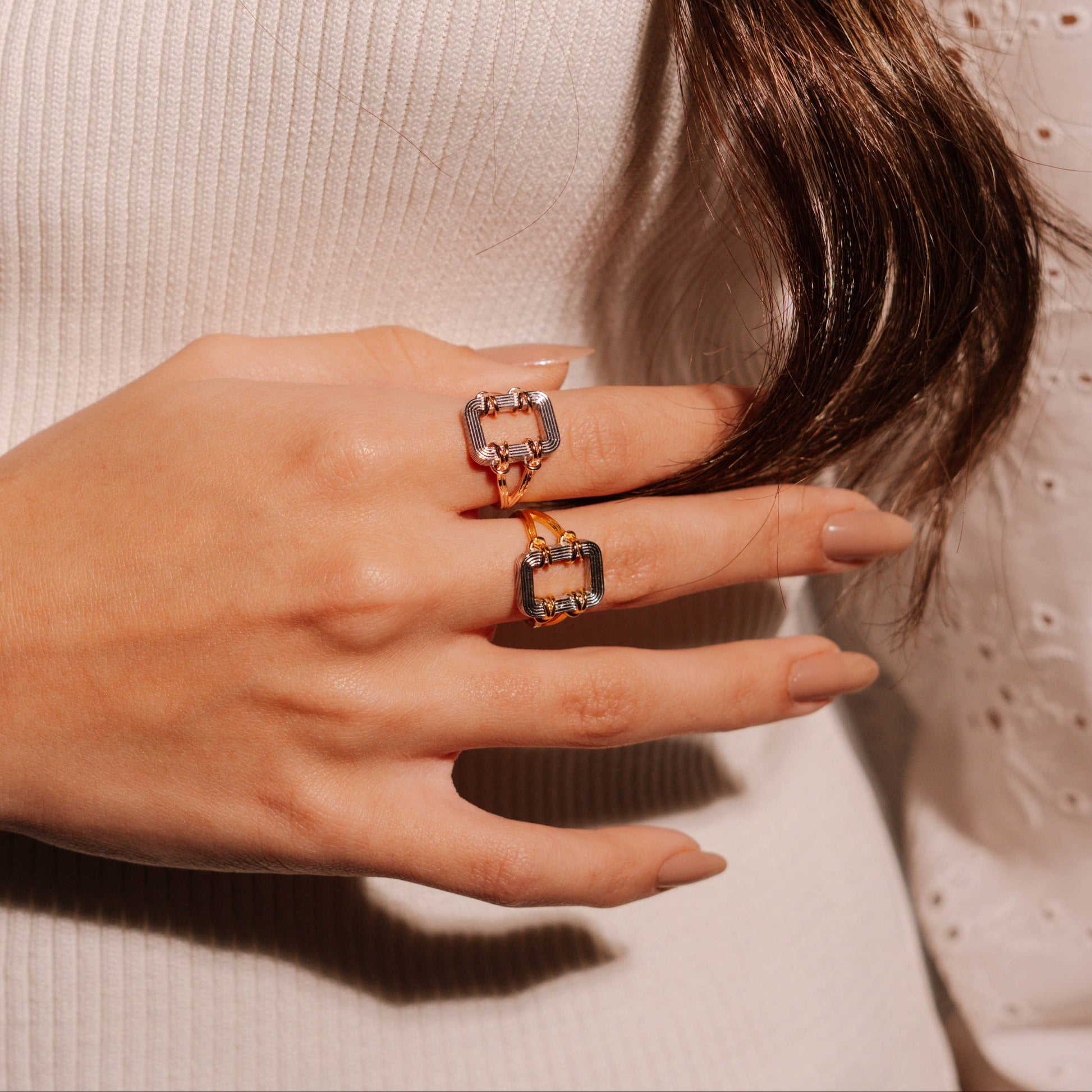 The Asha ring carries a strong artisanal spirit, as if sculpted from metal wires carefully reshaped into a square geometric frame that wraps lightly and elegantly around the finger. The design blends polished silver with warm rose gold, with the edges and coiled wire details finished in 25 layers of recycled 18-karat rose gold plating over 925 recycled sterling silver, creating a distinctive two-tone look that highlights the craftsmanship and adds a refined, luxurious touch.