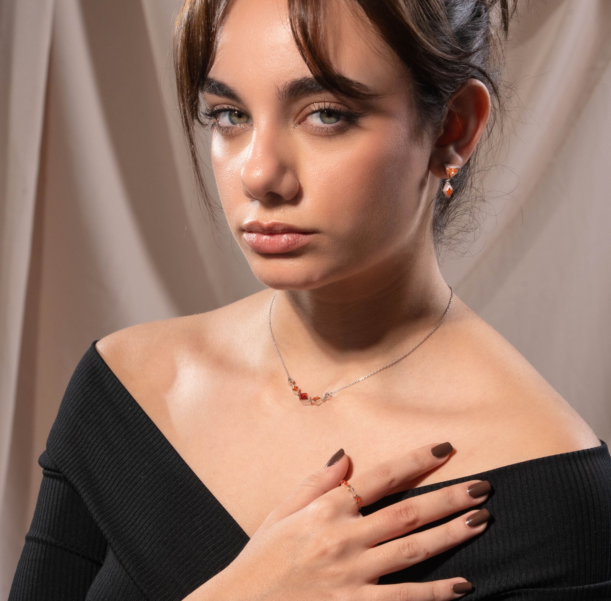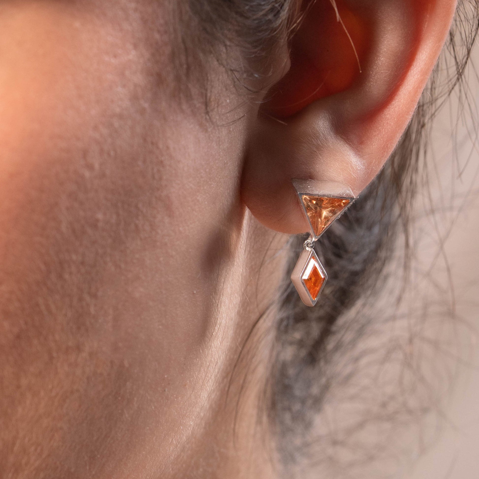 A triangular-cut stone in deep olive green sits above, while a diamond-cut stone in rich emerald green is suspended below. Each stone captures light from its unique angles, creating subtle movement and shifting brilliance that brings the piece into perfect balance between modern elegance and heritage-inspired design.